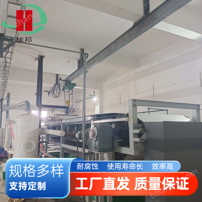 帶式真空抽濾機是一種通過真空吸力與重力作用實現(xiàn)連續(xù)固液分離的高效設(shè)備。其核心結(jié)構(gòu)包括環(huán)形橡膠濾帶、真空箱、濾布、驅(qū)動裝置及布料/卸料系統(tǒng)。濾帶由電機驅(qū)動連續(xù)運行,濾布鋪敷于濾帶表面,物料經(jīng)布料器均勻分布后,在真空箱形成的負(fù)壓作用下,液體穿過濾布進(jìn)入真空系統(tǒng),固體顆粒被截留形成濾餅。設(shè)備支持模塊化設(shè)計,可集成過濾、洗滌、干燥等多工序,實現(xiàn)全流程自動化操作。